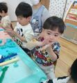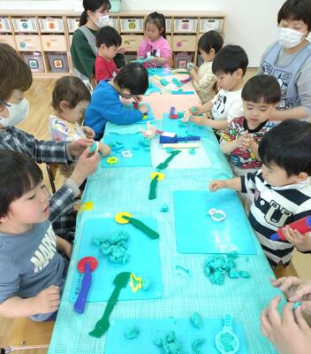 雨の日の楽しみ方 投稿: まちなか1 (14:23) カテゴリー: 園の様子 久しぶりの雨の日☔遊戯室と保育室でたっぷりと遊びました😄はいはい組(0歳児)は風船を追いかけたり、すべり台で遊んだり。実はすべり台、子ども達が好きなのは滑り降りることよりも、斜面を登っていくことなんですよ😆よちよち組(1歳児)にこにこ組(2歳児)は、なんだかとても静かだなあ~と思ったら……粘土遊びに夢中でした!「これピザだよ、食べてて!」と商品の売り込みにも熱心でした😁